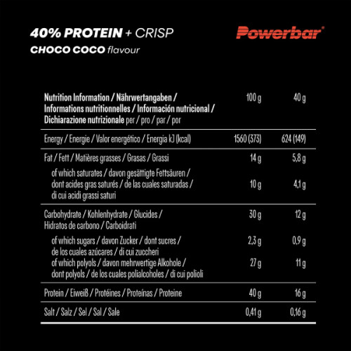 enty of exercise and a varied, healthy diet are important. At the same time, a protein-rich diet contributes to the growth and maintenance of muscle mass. The Powerbar® 40% PROTEIN + CRISP skilfully combines crunchy elements with a soft layer and is also low in sugars. This makes it the ideal reward after active exercise.